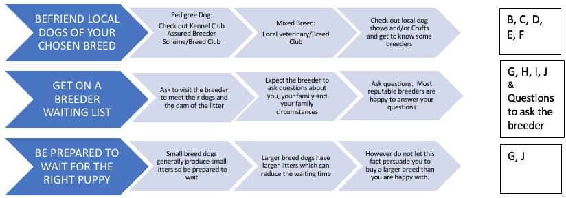 A. Research breed (pedigree).  If mixed breed (e.g. labradoodle, cockerpoo etc.) your research should be extended to all the breeds in the mix, if possible. This research can be carried out on the Kennel Club  This is to ensure that the puppy is suitable for your family.  The initial research is a really important step because far too many potential puppy owners buy a puppy on the spur of the moment or because it looks cute!  All puppies grow up and you need to find a puppy that fits in with your family life and circumstances.