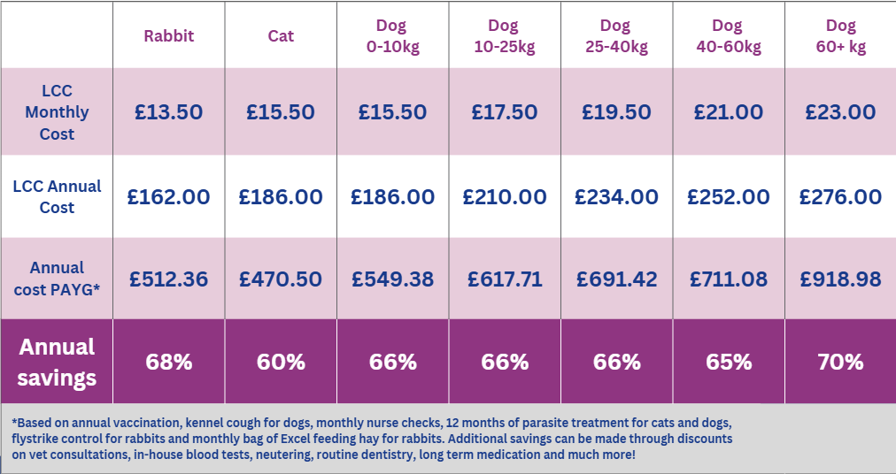 Rabbits are also included with vaccinations, monthly check ups and flystrike presentation over the summer months. They also get the added benefit of a free monthly 1kg bag of hay or 2kg of pellets too, the choice is yours.
